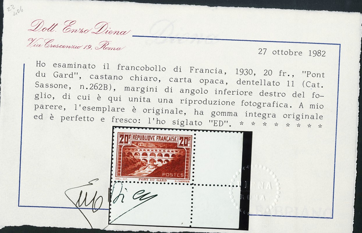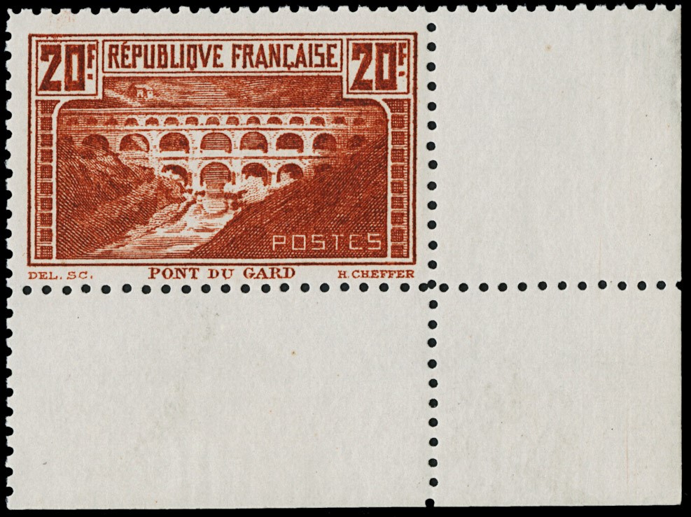 1929/31 - France: Pont du Gard 20F nut-brown, perf. 11, lower right corner margin, MNH. Cert. E.Diena (Yvert 262B – Euro 2,500)