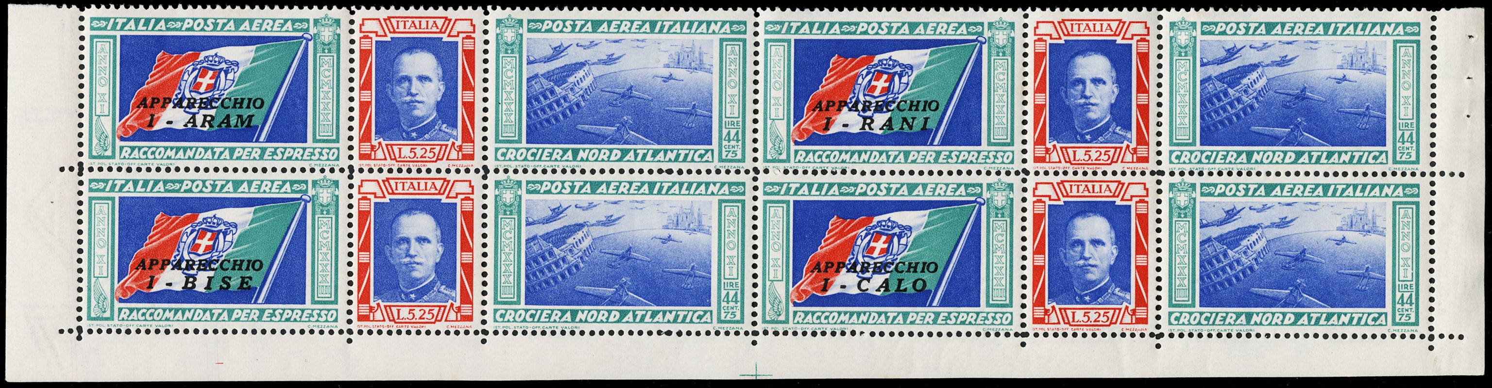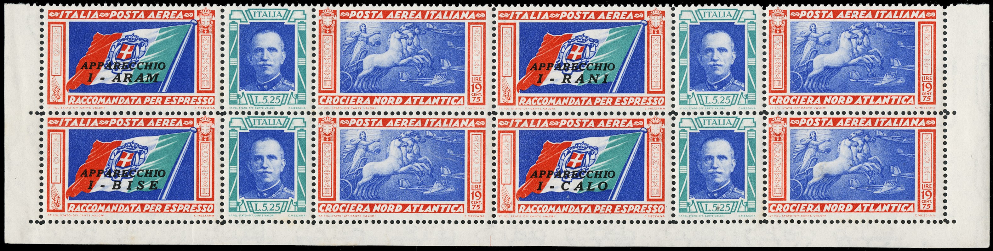 1933 - North Atlantic Flight, triptychs, the two 'I-RANI' and 'I-CALO' values, blocks of four with corner and lower sheet margins, MNH (Sassone PA51/52E + PA51/52P – Euro 3,000+)