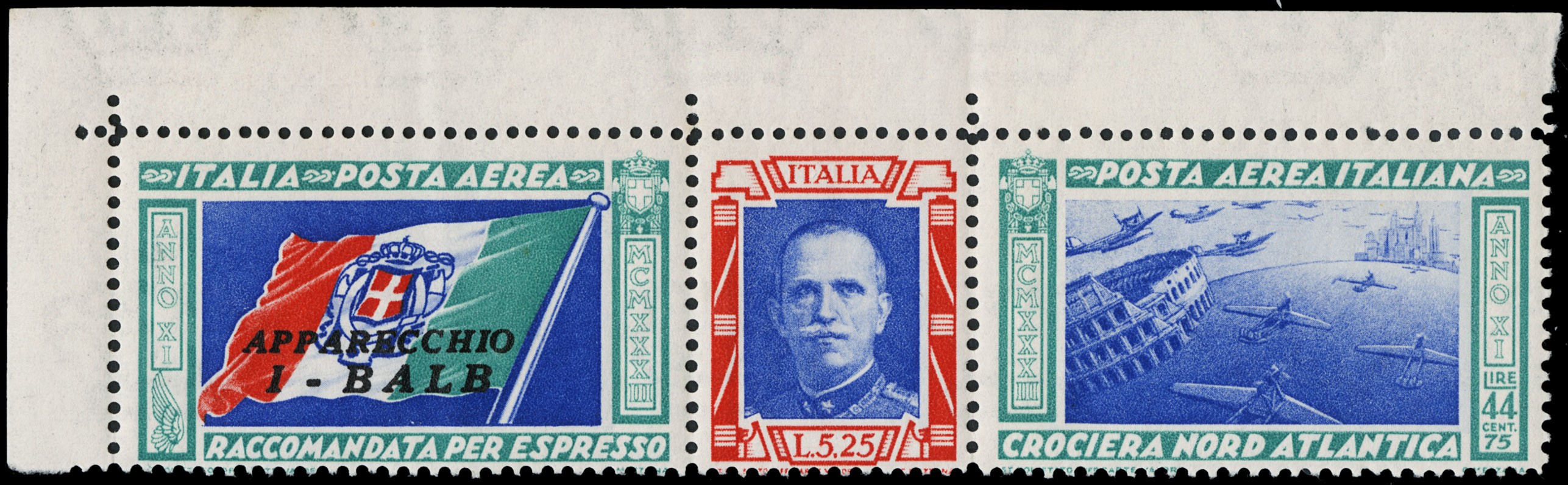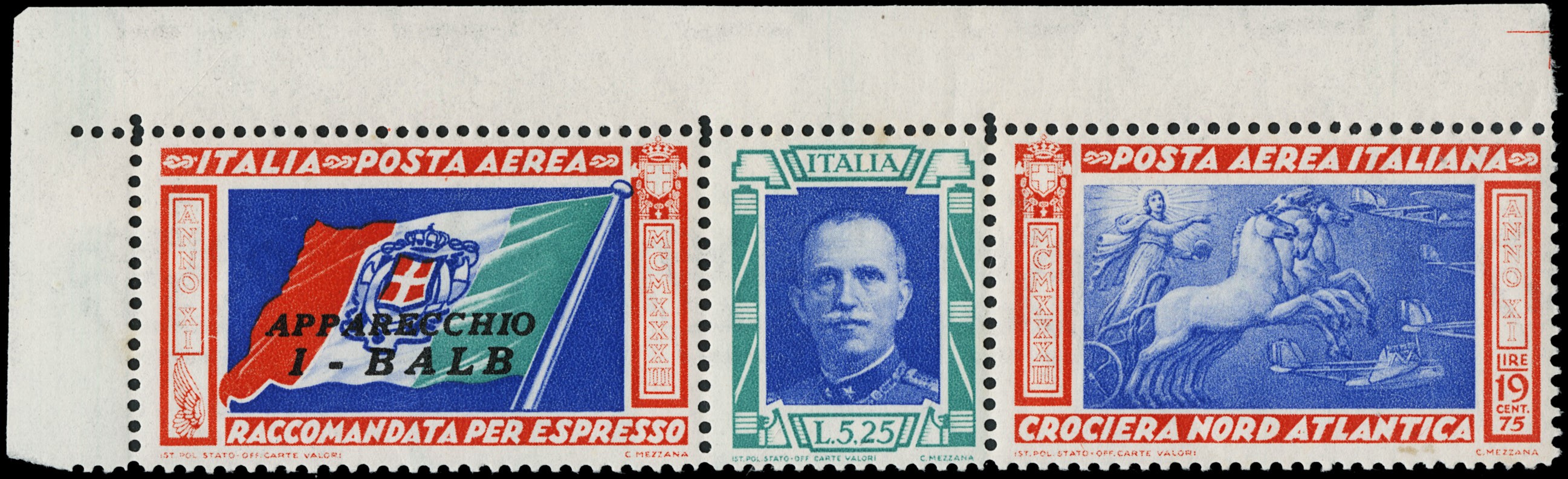 1933 - North Atlantic Flight, triptychs, the two denominations 'I-BALB' sheet corner and MNH (Sassone PA51A/52A - Euro 800)