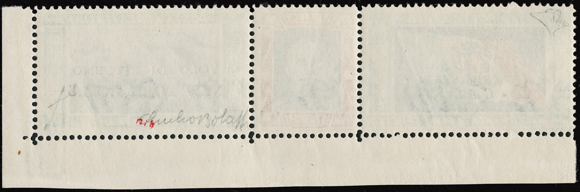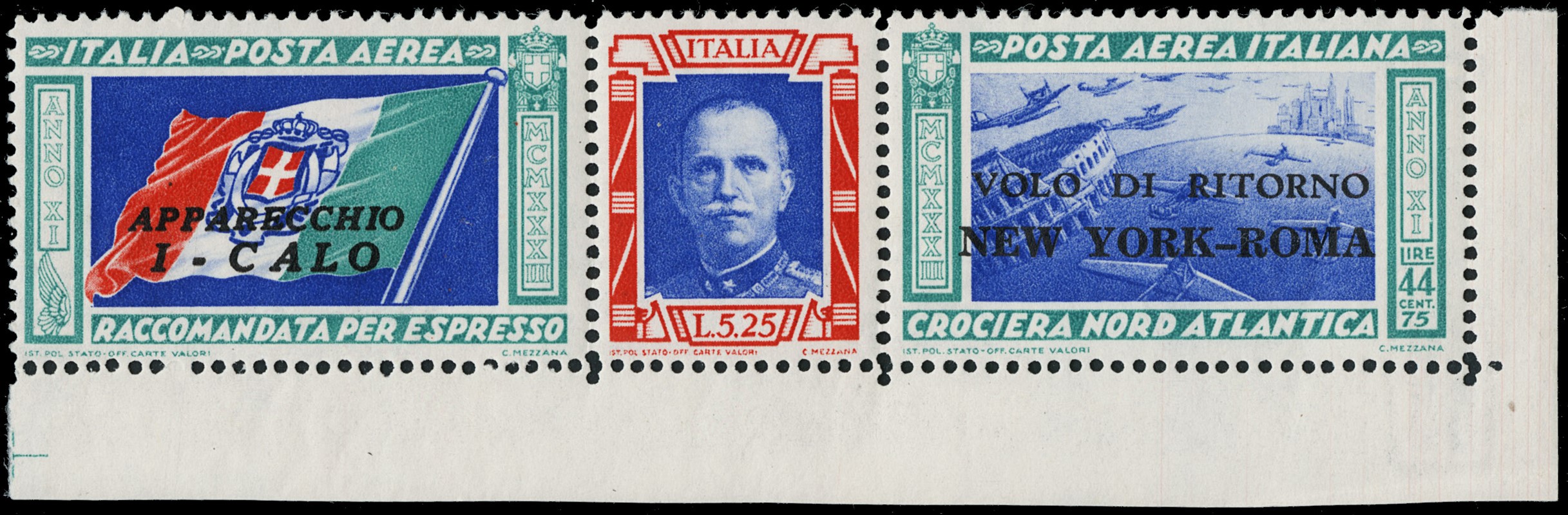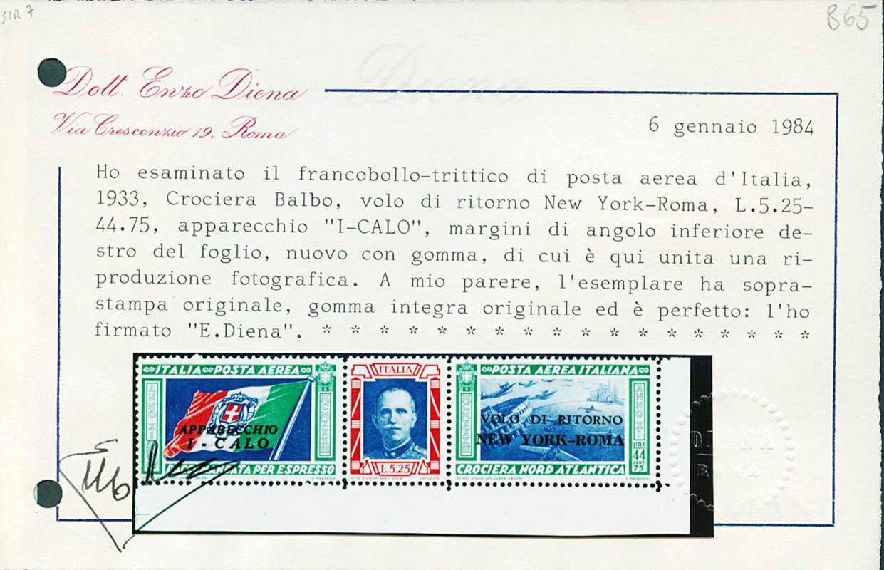 1933 - Return Flight New York–Rome, triptych 5.25L + 44.75L multicoloured 'I-CALO', block of four with corner margin, MNH. Rare. Signed Fiecchi and Giulio Bolaffi, cert. E.Diena (Sassone PA53 – Euro 67,500)