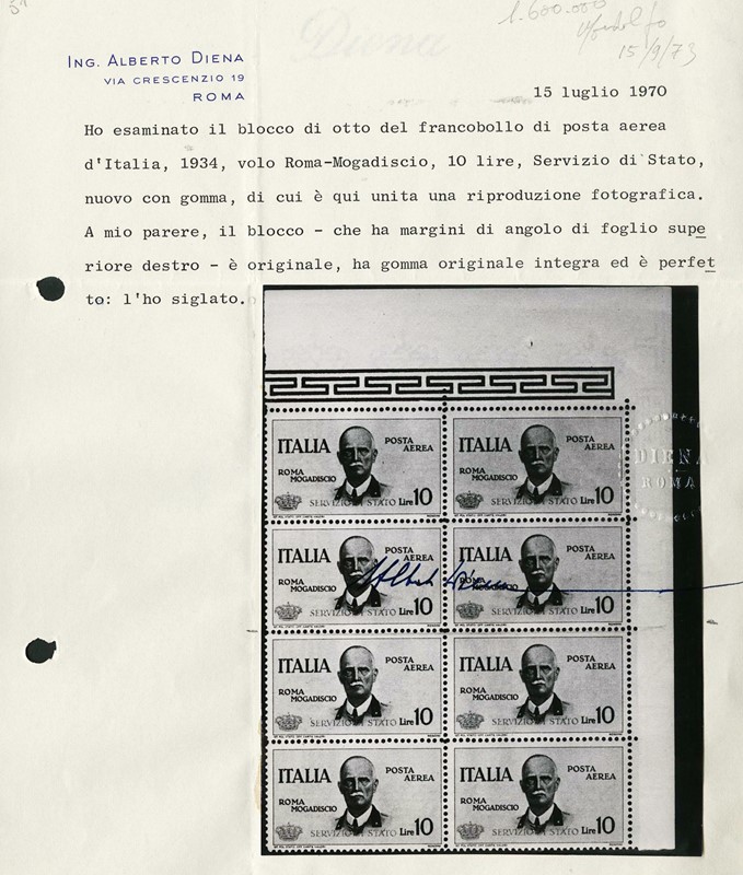 1934 - 10L slate 'Coroncina' BL4 MNH. Cert. A.Diena (Sassone SA2 - Euro 13,000+)