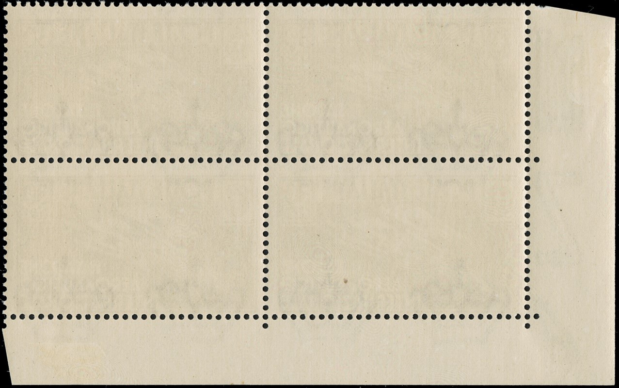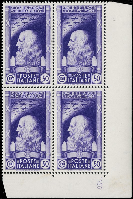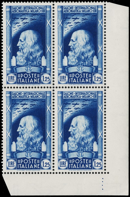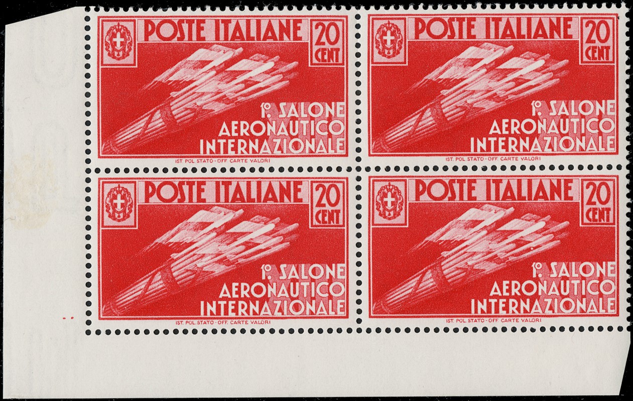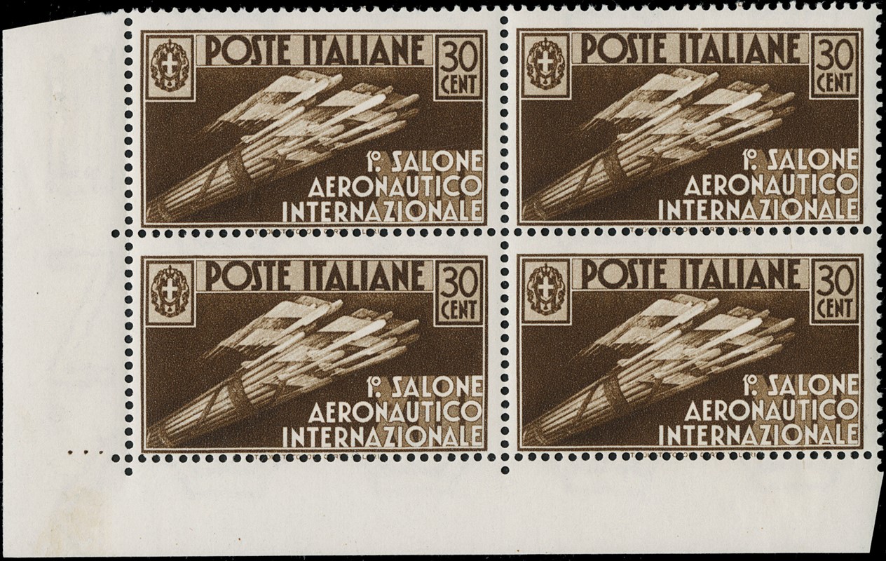 1935 – International Aeronautical Exhibition, complete set of four values in blocks of four, MNH with corner margin (Sassone 384/387 - Euro 9,000+)
