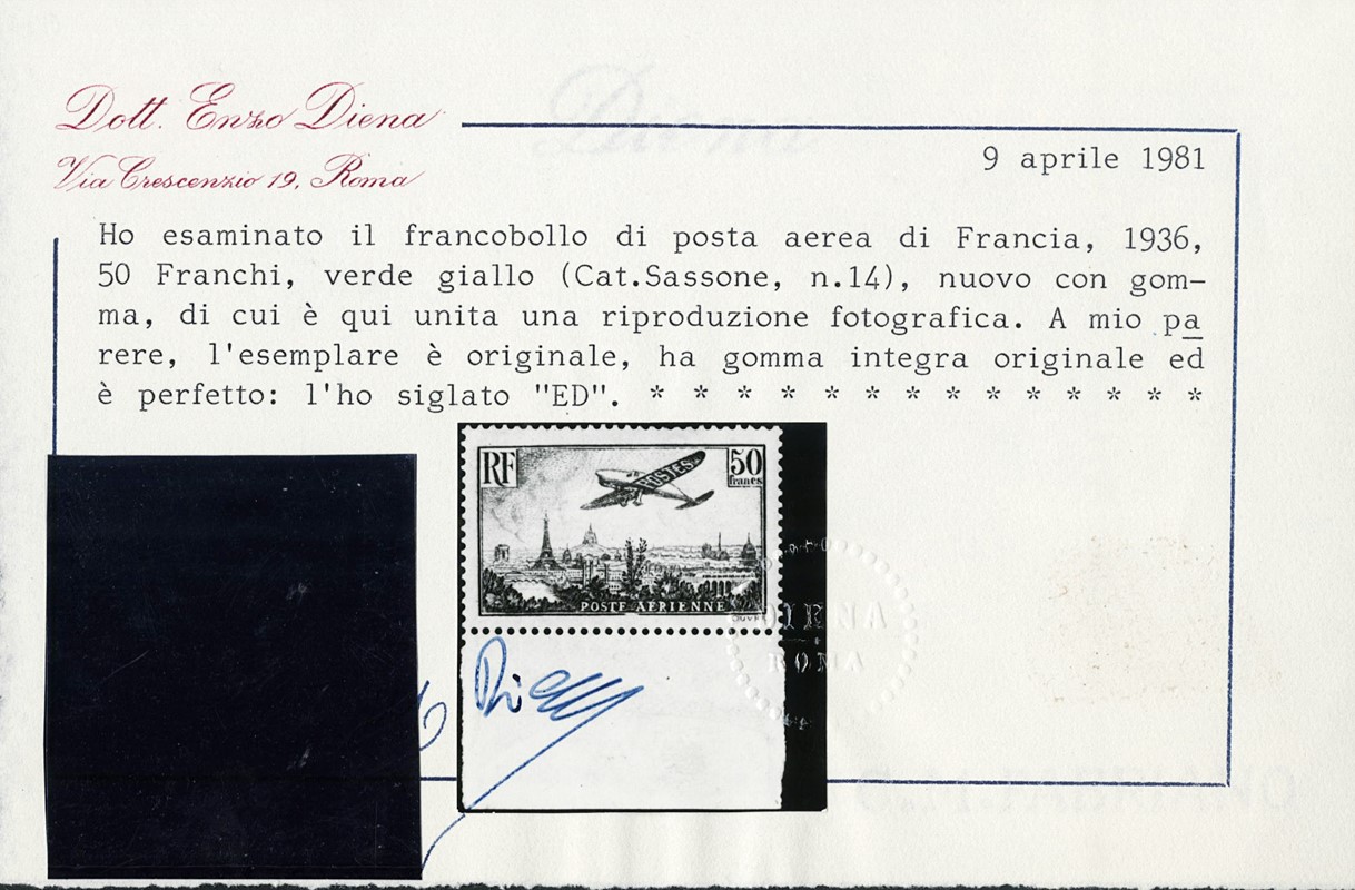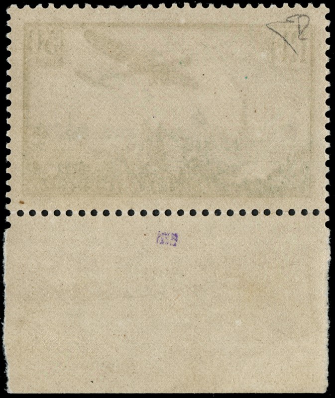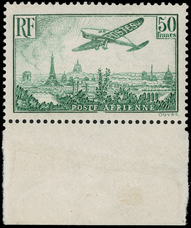1936 - France: Air Mail 50F green-yellow, lower sheet margin, MNH. Cert. E.Diena (Yvert PA14 – Euro 2,000)