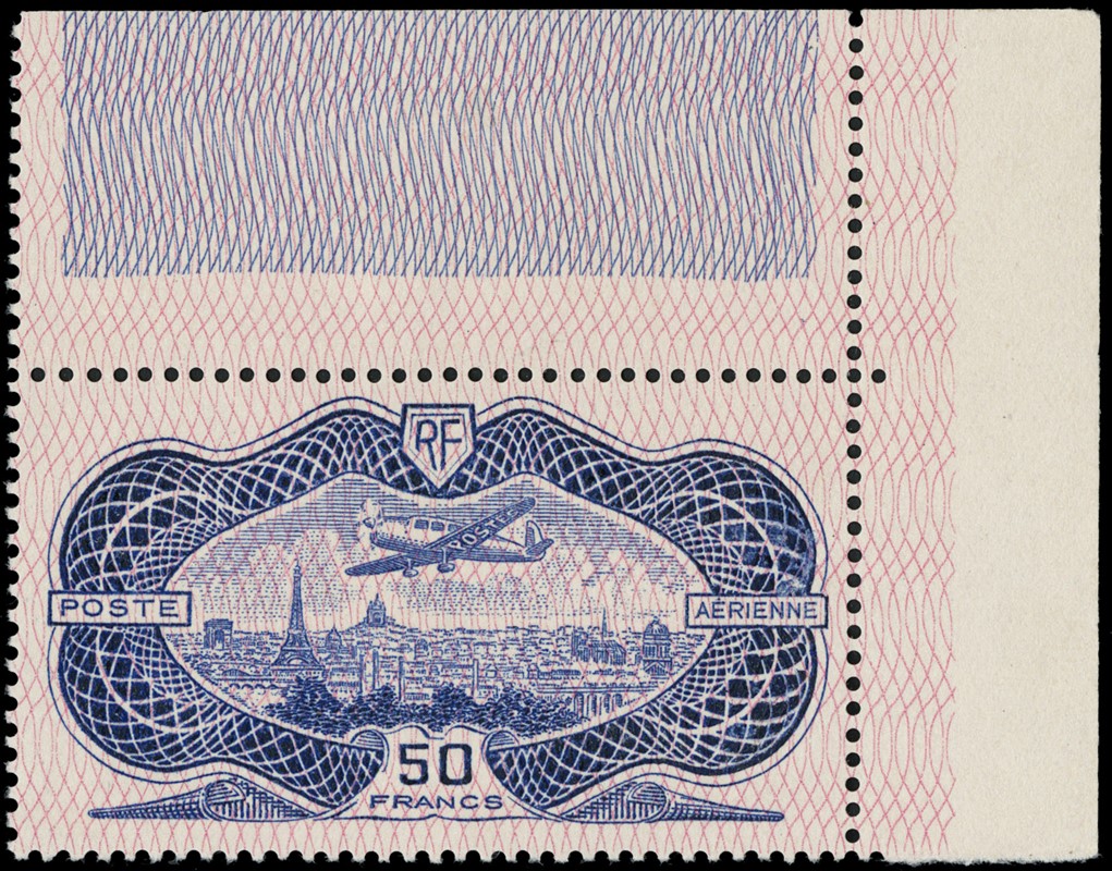 1936 - France: Air Mail 'Burele'' 50F ultramarine, upper right corner margin, MNH, hnged only at upper edge (Yvert PA15 – Euro 1,500)