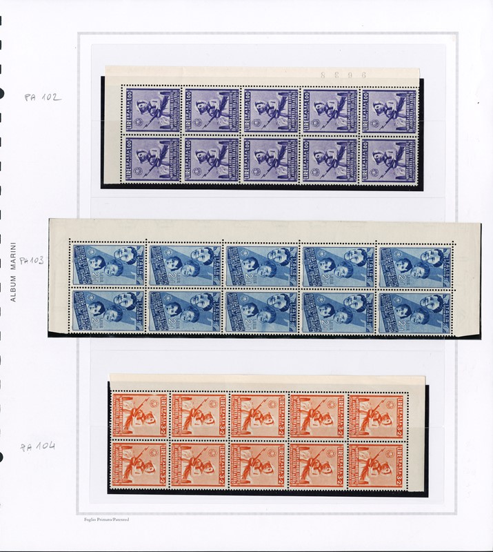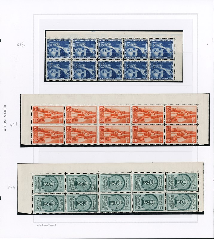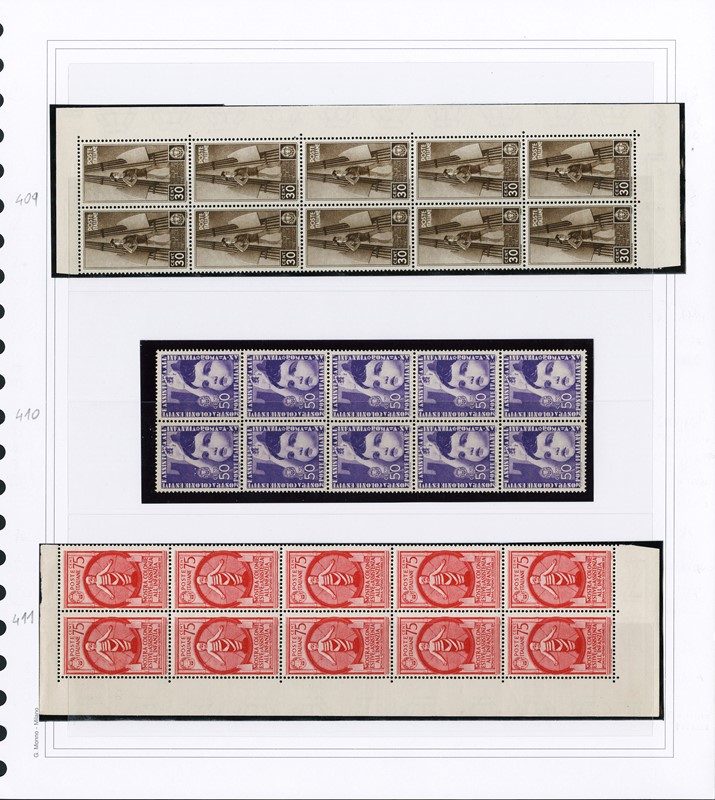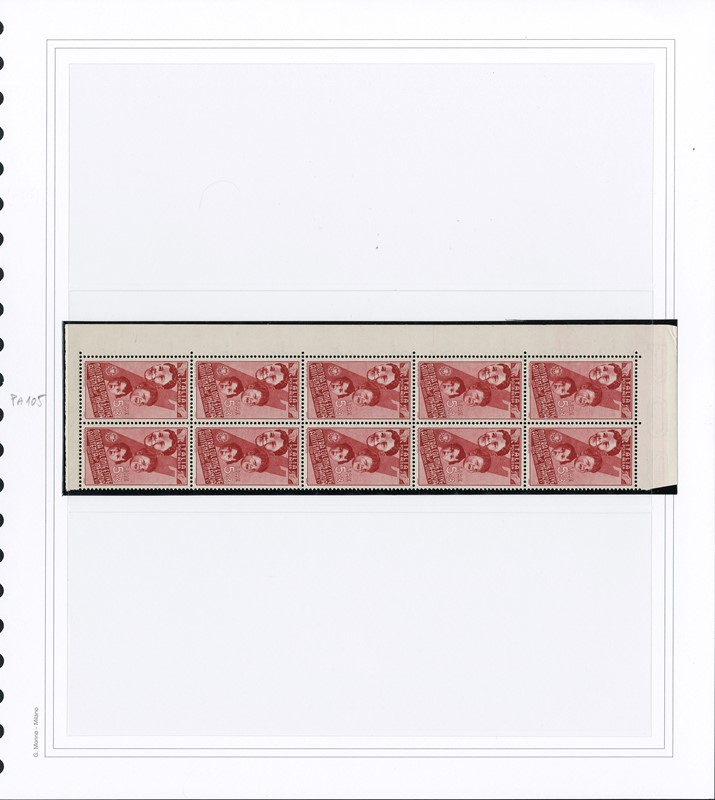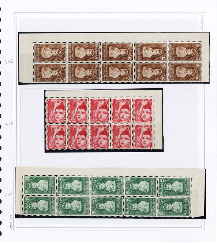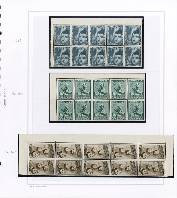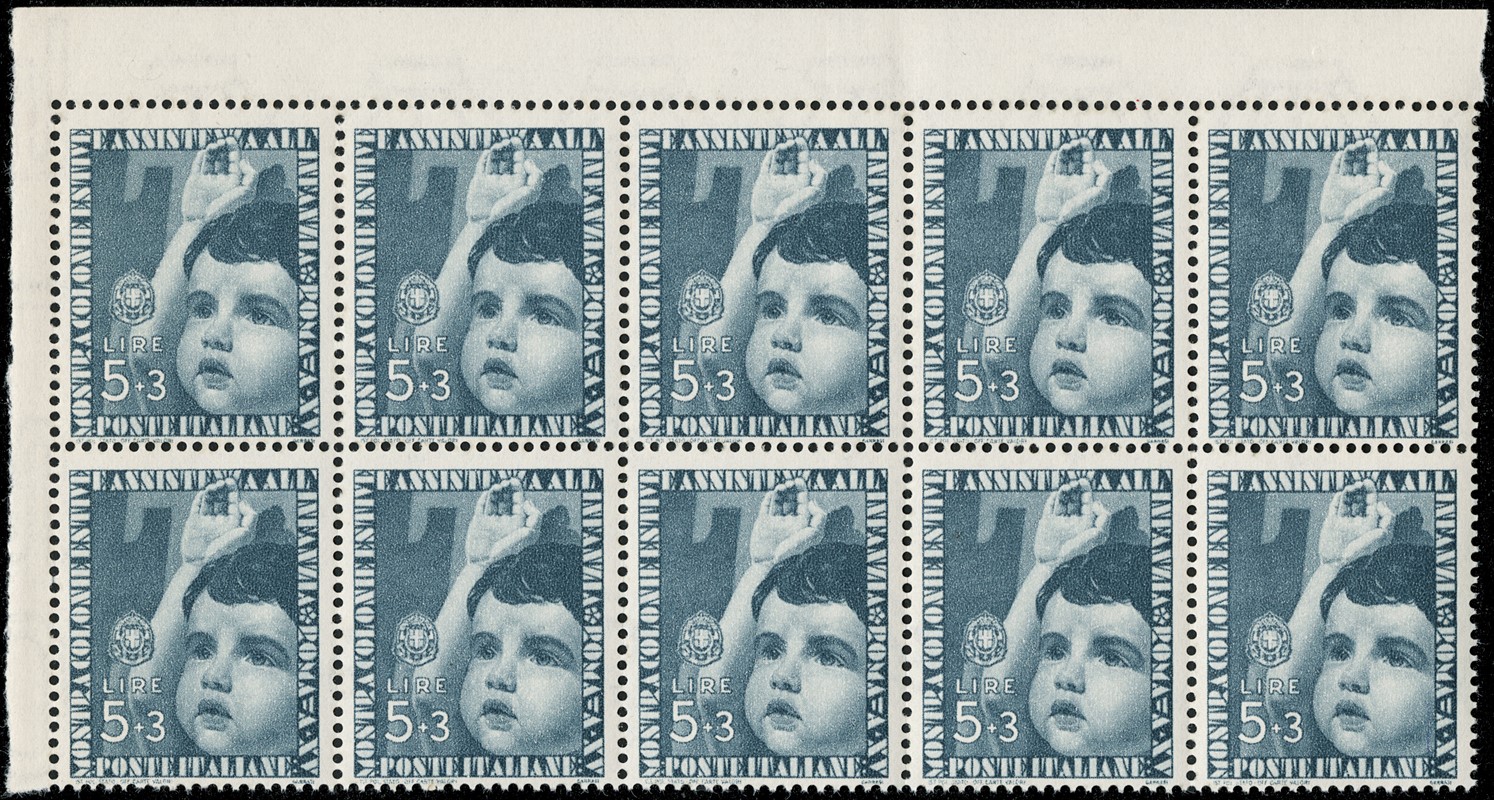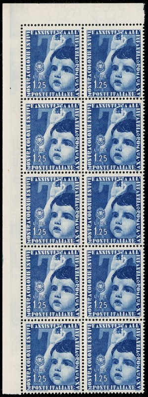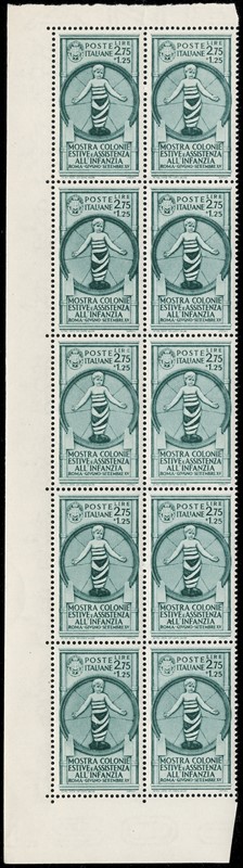 1937 - Summer Camps and Child Welfare Exhibition, complete set of 16 values (including airmails) in blocks of ten (BL10), MNH, almost all well centred and with sheet or corner margins (Sassone 406/415, PA100/105 – Euro 9,000 +25%)